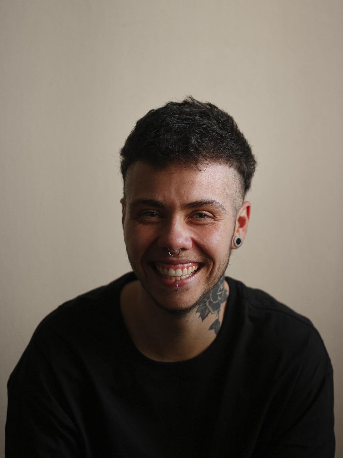 Eu tava indo em uma outra terapeuta e eu toquei no assunto na terapia… Eu tava ficando com uma mina que era bi e não monogâmica, e ela ficava com caras. E eu ficava muito no teto de ficar me comparando com os caras, só que de uma forma muito ruim, tipo, "meu deus, não tenho pau, não tenho barba, não tenho um corpo masculino". Eu ficava muito tetiando [de teto, uma gíria de Porto Alegre que, nesse contexto significa pensar demasiadamente] em cima disso. E eu comecei a me sentir muito mal. Levei isso pra terapia e falei que tava confuso, que tava até com pensamento de achar que era um homem. E ela não adentrou muito no assunto, essa minha terapeuta, sabe. Daí eu fui mais algumas vezes com ela e mudei de terapeuta. É a que eu vou até hoje assim, ela super lidou de uma forma muito massa e que fechou comigo. Porque hoje em dia falo até um pouco melhor, mas eu sou muito travado, eu solto o assunto e depois eu fico quieto, tá ligado, você que resolva (risos). E daí ela pediu pra eu levar fotos. Eu mostrava as fotos e, a partir das fotos, eu falava o que eu via. Eram auto retratos... E daí, bá, foi super fundamental isso. Quando eu comecei a verbalizar isso do que eu tava sentindo, do que eu tava confuso, eu fui começando a me aproximar mais da comunidade trans, da comunidade queer.